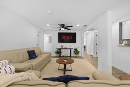 The den includes a smart TV and a dedicated workspace, making it ideal for remote work. High-speed Wi-Fi is available throughout the home.