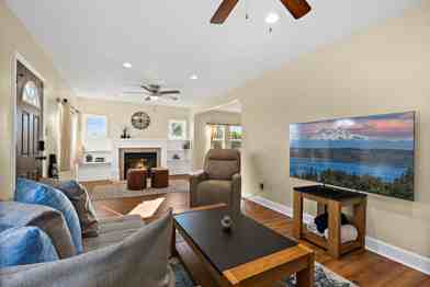 Inside, you’ll find brand-new hardwood flooring throughout the main level and a spacious living and dining area, complete with a large smart TV, cozy fireplace, and a comfortable dining setting perfect for gathering. The freshly updated kitchen features stainless steel appliances, a gas range, and all the essentials you need to prepare a home-cooked meal. Off the living area, a convenient full-size washer and dryer, a stylish full bathroom, and the primary bedroom await. The master bedroom offers a plush queen bed and its own smart TV for winding down in comfort. Upstairs, you’ll discover a private second bedroom with another queen bed, creating the perfect set-up for families or friends traveling together.
