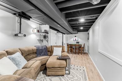 The basement includes a private office with two desks, chairs, and a printer, making it ideal for remote work. High-speed Wi-Fi is available throughout the home.