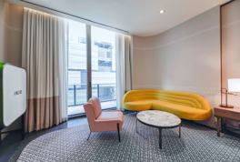 Step into this stylish and modern suite at SLS Lux Brickell, thoughtfully designed for a sophisticated and comfortable stay. Enjoy your morning coffee or an evening cocktail on the private balcony while taking in charming city views. Unwind in a serene sleeping area with a plush king-size bed and an LCD TV. A convenient kitchenette includes a mini-fridge, microwave, coffee maker, and dishwasher, plus a dining area for two. A washer and dryer are included inside the unit for a hassle-free stay.