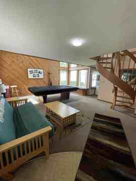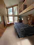 The downstairs bedroom is furnished with a Queen bed, while the Master bedroom on the second floor boasts a King bed and direct access to a second-level deck. The third bedroom includes a Queen bed and a bunk bed. Additional amenities include a pool table and a loft with games, ensuring entertainment for everyone.
