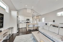 The property is fenced and equipped with a gate with an electronic lock. The front of the unit boasts an open concept living, dining, and kitchen area, furnished to create distinct dining and living spaces. A sofa faces the UHD TV and is equipped with a Sonos sound system. The dining table seats four, with an additional sitting area behind the sofa providing two more chairs for larger groups. The shared bathroom is located at the top of the stairs next to the washer and dryer. The master bedroom, located at the end of the hallway, features a walk-in closet and an en-suite bathroom with a walk-in shower. The shared bathroom includes a shower over tub.