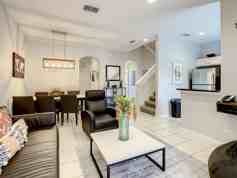 Relax in the bright, open-concept living room with a comfortable seating area and a large flat-screen TV, perfect for unwinding after a fun-filled day at the parks. Cook up delicious meals in the fully equipped modern kitchen featuring a stove, microwave, refrigerator, dishwasher, and small appliances. Enjoy your meals in the elegant dining area, ideal for family dinners or casual breakfasts. The townhome features three full bathrooms, all sparkling clean and stocked with fresh towels for your convenience. Step out onto the private screened patio, where you can enjoy a peaceful retreat surrounded by lush greenery, perfect for sipping your morning coffee or relaxing in the evening.