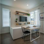 Your home features the revolutionary "Ori" robotic furniture system. This high-tech, built-in solution moves with your needs, creating multiple functional rooms within one intelligent space. With the touch of a button, you can reveal your private bedroom alcove, a dedicated workspace, or a spacious living area.