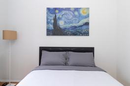 This cozy and convenient 2-bedroom apartment features two separate bedrooms, a common area that combines a kitchen with a small dining table and chairs, and a centrally located bathroom. Each bedroom is tastefully furnished. The master bedroom boasts a queen-size bed and a TV, while the second bedroom provides a full-size bed and a TV as well. Both bedrooms are equipped with closets, heating/air conditioning units (availability may vary according to the season), and windows that let in plenty of natural light. In the common area, you'll find a well-equipped kitchen complete with appliances such as a toaster, microwave, oven, electric kettle, fridge/freezer, and stove. Clean linens and towels will be provided for your comfort, ensuring a relaxing stay.