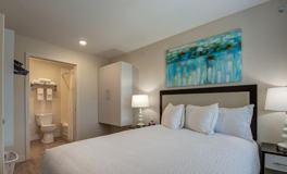 Feel at home in this fully equipped one-bedroom, one-bathroom suite featuring a modern kitchen with full-size appliances, including a refrigerator, dishwasher, microwave, stove-top, and pantry. The living area is adorned with modern design elements and comfortable furnishings, while the bedroom offers maximum relaxation with a queen-size bed, soothing color scheme, and a closet with efficient storage shelving. A full-size washer and dryer are conveniently situated in the apartment.