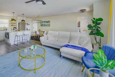 The home is a fully remodeled 1983 property featuring dedicated workspaces with office supplies. It includes a fully stocked kitchen with an electric induction cooktop, oven, microwave, cookware, and dishes for home-cooked meals. Kitchen appliances also include a refrigerator, freezer, coffee machine, tea kettle, French press, toaster, and blender. Both bathrooms offer a modern luxury feel with stocked essentials. The laundry room is equipped with a full-size washer and dryer with detergent. Smart TVs are available in the master bedroom and living room.