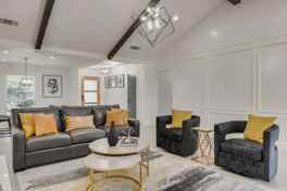 This home caters to both short-term and medium-term stays, making it an excellent choice for corporate housing needs. The interior is beautifully renovated with a spacious open-concept and brand-new flooring throughout. High-end features and finishes make this feel like a luxury home, accented by luxe décor and furnishings. The living area features vaulted ceilings and exposed beams, creating a warm and spacious atmosphere. Gather around the cozy furniture and wood-burning fireplace. The kitchen boasts a stunning backsplash, gold faucets and handles, and top-of-the-line appliances. With 5 large bedrooms, there's plenty of room for everyone to spread out. Two rooms feature French doors leading to the backyard with a pool view. The bathrooms are modern and sleek, with the master bath offering a walk-in shower, soaking tub, and double vanity. The backyard is a relaxing oasis with a covered patio, lounge chairs, and a hammock.