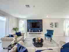 Relax in a cozy yet modern space with plush seating and a smart TV in the spacious open living area. Cook up a feast in the fully equipped kitchen with stainless steel appliances and dining space for the whole family. Enjoy comfortable bedrooms, including a luxurious master suite and two more bedrooms for a touch of magic. Unwind on the private patio and outdoor space with your morning coffee or evening drink. For added convenience, there is a laundry room with a washer and dryer. Stay connected and entertained with high-speed Wi-Fi and smart TVs.