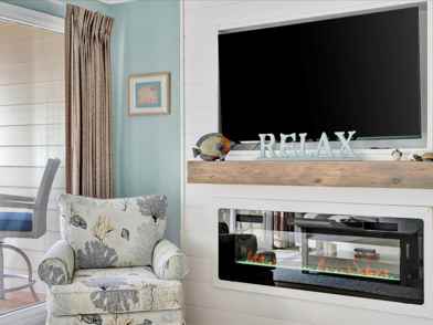 This condo features an open, sun-filled layout with an electric fireplace, a comfy sofa with a pull-out bed, and 2 Smart TVs. The fully furnished private balcony includes a table and chairs. High-quality towels, sheets, and toiletries are provided, along with complimentary gourmet coffee and beach gear, including chairs, towels, and a bag.