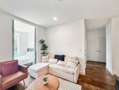 This beautifully designed apartment features an open-concept living area with contemporary decor, warm finishes, and a comfy sofa bed, perfect for lounging or accommodating extra guests. The serene primary bedroom includes a plush queen bed and a spacious closet, while the second bedroom offers a queen-sized bed, cozy bedding, and a crib for those traveling with little ones. The fully equipped kitchen comes with stainless steel appliances and all the essentials for meal preparation. A spa-inspired bathroom with tiled finishes, a spacious tub/shower combo, and complimentary toiletries completes the space.