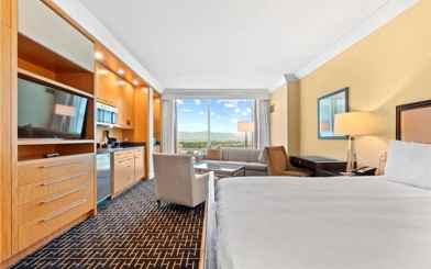 A $65 daily resort fee and a $135 cleaning fee are payable to the host before check-in. The resort fee includes pool and gym access, daily housekeeping, fresh towels, linens, and free coffee and water daily. Pets under 25 lbs are allowed with a $200 fee paid to the host and a $50 refundable pet deposit paid at the front desk. Complimentary valet parking is available. On-site dining options include a restaurant, bar/lounge, and poolside bar, with breakfast available for USD 16–26.