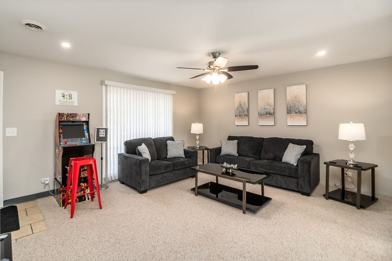 This ranch home includes a 1-car garage and driveway. The spacious master bedroom features a desk for work or school and an attached bathroom. Enjoy entertainment with the standard arcade cabinet loaded with 2,000 classic games, as well as a selection of cards and board games.