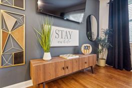 This home offers an exceptional set-up with three fully equipped kitchens, providing privacy, flexibility, and comfort. The ground floor features a cozy living room with a Smart TV, a modern kitchen with stainless steel appliances and dining for four, and a queen master suite with a private bathroom (shower). The second floor features two additional fully equipped kitchens, a spacious second living room with a Smart TV, and three full bathrooms. Wi-Fi, Smart TVs, ceiling fans, and hotel-quality linens are included in every room. A welcome tray with snacks and Keurig K-Cups is also included.
