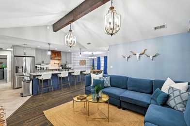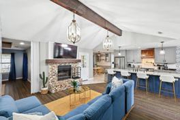 This Keller home caters to both short-term and medium-term stays, making it an excellent choice for corporate housing needs. Full of southern charm and bold personality, it offers a cinema room, a backyard pool, and a gourmet kitchen with upgraded countertops, a farmhouse sink, and a kitchen island. The living room is tastefully furnished with a vaulted ceiling, providing a spacious atmosphere. The dining area includes a breakfast nook, kitchen island seating, and a dining table for sit-down meals.