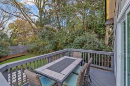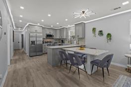 Step inside to discover custom-designed furniture and meticulous attention to detail, elevating your stay to a luxurious experience. The airy living room offers ample space to lounge, adorned with a plush sofa and vibrant accent chair. The dining and kitchen area provides a generous setting for shared meals around a stylish modern wood table, whether you're indulging in home-cooked delights or sampling local takeout. The expansive backyard and spacious front porch beckon for leisurely conversations and cherished family moments.