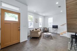 The property layout is thoughtfully designed for comfort and convenience. On the first floor, you'll find a cozy living room with seating and a smart TV, an open kitchen fully stocked for in-home meals, dining or workspace seating for two, a bedroom with a queen bed, a full bathroom with a walk-in shower, and a washer and dryer. The second floor features another bedroom with a queen bed, seating for two, and a second full bathroom with a shower/tub combo. Outdoors, enjoy seating for two under string lights, perfect for relaxing with an afternoon cocktail.