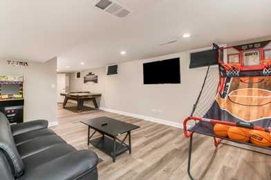 The updated home, renovated in 2021, features a modern kitchen with updated flooring. The kitchen is fully equipped with utensils, cooking spices, and oils. For entertainment, the basement offers darts, a 2-player electronic basketball game, an arcade cabinet with 2,000 classic games, a pool table, and ping pong. There is also a lounge area with a sofa and TV, plus cards and board games. This home is children friendly with a pack and play sleeper, a stroller, a high chair, and a booster seat. Technology includes 6 LCD televisions with access to Hulu, Disney, and ESPN streaming services in English and Spanish. Netflix and Prime Video access are available with your own login. There is up to 300 MBPS internet speed with Wi-Fi throughout the entire home and an ethernet hard line available. The living area and lounge area have a 55" TV, and all 4 bedrooms have 40" TVs. A sound bar is included in the living room.