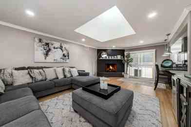 The spacious living room is equally impressive with new marble flooring, elegant chandeliers, and recessed lighting, establishing a warm, upscale ambiance. Eye-catching board and batten accent walls add architectural interest in both the living and formal dining rooms.