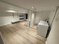 Furnished with microwave, dining table, tv table, queen bed frame [no mattress]. Bell Fibe WiFi is included in the rent. Very safe/accessible area. Exactly as seen in pictures: washroom, kitchen, living room, laundry area, separate bedroom. Please note low ceiling height in unit. Move in ready