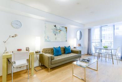 Feel at home in this modern, furnished 2-bedroom and 2-bathroom condominium located just steps from all major downtown Toronto hotspots. With the TTC at your door, this suite offers a king-size bed in the main bedroom and a queen bed in the second bedroom, comfortably sleeping up to four guests. The suite is equipped with a full kitchen and in-suite laundry, ensuring convenience and comfort for a minimum stay of 30 days.