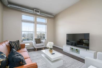 Feel at home in this centrally located three-bedroom apartment in Downtown Indianapolis. Enjoy the spacious living room, kitchen, and laundry facilities, along with a private patio surrounded by nature and mature trees. Perfect for business travelers and remote workers, the apartment features an office desk, chair, and fast Wi-Fi, making it ideal for longer stays.