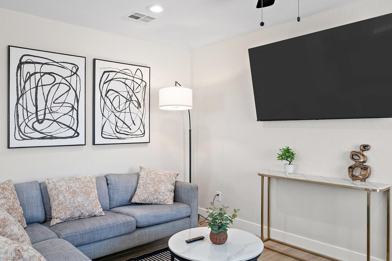 This fully furnished apartment includes a full kitchen, a dining set with 4 seats, central AC and heating, and a fully fenced backyard with a patio set. The kitchen is equipped with a full-size fridge, 4-burner stove, microwave, oven, dishwasher, air fryer, blender, seasoning, cookware, coffee maker, ground coffee, coffee mugs, drinking glasses, and wine glasses. You'll also find a washer and dryer in the unit and 3 smart TVs.