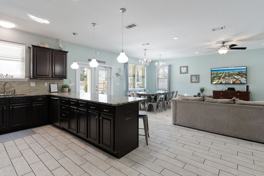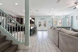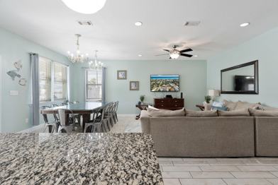 The living area is cozy with a sectional couch, two accent chairs, and a TV with standard Cox cable for your entertainment. The open layout kitchen is fully stocked with a fridge, dishwasher, range, microwave, and more, making it easy to gather around the dining table with seating for 12 or the breakfast bar for 8. A full-size washer and dryer are also available for your convenience.