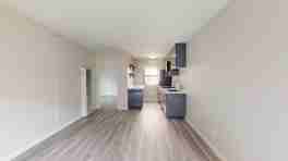 Kitchen and Living Area – Remodeled with great countertop space, modern cabinetry, custom designer backsplash, custom undermount sink, stainless steel appliances including refrigerator, electric range oven and microwave! Covered in engineered wood flooring and new paint throughout!