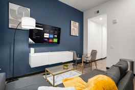 This spacious 1-bedroom apartment features inviting living areas, a fully equipped kitchen, and a bathroom complete with toiletries. Enjoy access to the building's fitness center with strength and cardio rooms. Additional amenities include an in-unit washer and dryer, a smart TV with streaming apps, a TV in the living room, and complimentary coffee.