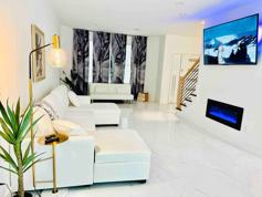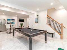 Designed with you in mind, this home features a bright, white, modern Miami-style interior with a crystal chandelier and dramatic staircase. The open concept main floor flows seamlessly from the living room to the dining area, kitchen, and backyard. The kitchen is an entertainer's dream, fully stocked with essentials and extras like a toaster, blender, and food processor. Enjoy meals at the glass dining table or the kitchen island, both accommodating larger groups. The home also includes a game room with billiards and a putting green, a second living room, and TVs in almost every room.