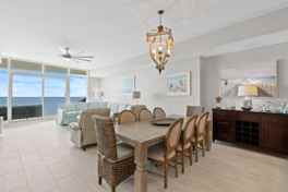 The master suite is a true oasis, featuring a lavish king-size bed and a 55-inch flat-screen TV. The attached master bath is equally indulgent with a Jacuzzi tub and a separate walk-in shower. The second bedroom boasts another king-size bed and a private bath with a walk-in shower, while the third bedroom offers two full-size beds and a private bath with a jacuzzi tub shower combo. Each guest room is equipped with a 55-inch flat-screen TV for your entertainment. Culinary enthusiasts will delight in the fully equipped kitchen with granite countertops, perfect for preparing delicious meals to savor in the elegant dining area overlooking the Gulf.