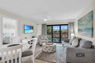 The resort offers a heated swimming pool with lounge chairs and umbrellas, tennis on 2 courts, pickleball on 6 courts, beach volleyball, a basketball hoop, and racquetball. There is a fully equipped fitness center located in the lobby and lakefront walking paths to enjoy the native wildlife. Guests can use the island gazebo with barbecue grills for a leisurely meal. On-property dining is available at Hogfish Harry's Restaurant and Bar, offering delicious seafood and a full bar with indoor or al fresco dining options.