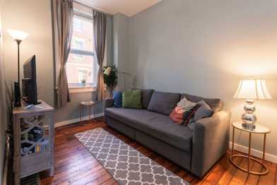 The apartment retains its historic charm with intact hardwood floors, while offering modern amenities such as a Roku TV with cable channels provided through the Spectrum App. You can stream HBO, Netflix, YouTube, and other apps, providing entertainment options for a cozy night in.