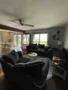 Welcome to this beautifully appointed four-bedroom shorefront home, perfect for a lakefront vacation. With a spacious living room featuring a fireplace and a wall of windows overlooking the lake, you'll feel at home in this inviting space. The fully equipped kitchen and first-floor bedroom, along with a bath and laundry, add to the convenience of this charming residence.
