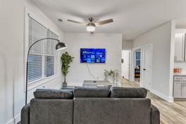 Begin your day with a perfectly brewed cup of tea or instant coffee—decaf or regular—prepared just the way you like it from the convenient coffee station in your upscale kitchen. Whether you're here for business or leisure, this space is designed to provide the perfect balance of comfort and convenience. With vibrant restaurants just minutes away, you might find yourself exploring the culinary scene in Durham each night. After a long day, it’s reassuring to know that your well-equipped kitchen and elegant dining table are ready to provide a 5-star dining experience right at home. Whether you choose to venture out or stay in, this space serves as the perfect home base for work, relaxation, and entertainment. Step inside and discover an inviting open-concept living area, elegantly furnished to provide a blend of relaxation and functionality. Large windows flood the space with natural light, while modern décor and high-end finishes create a sophisticated yet comfortable atmosphere.