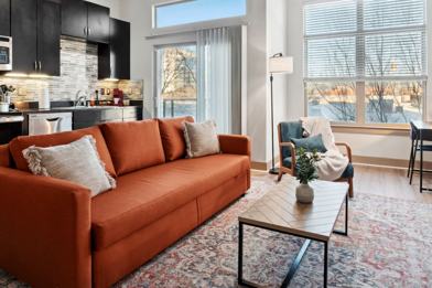This thoughtfully curated apartment offers a fully equipped kitchen with a Keurig coffee maker and complimentary coffee and tea. Relax in the living room with ROKU 4KHDTV available in both the living room and bedroom. The apartment also includes central A/C and heating, an in-unit washer and dryer, and a private workspace, ensuring both comfort and convenience during your stay.