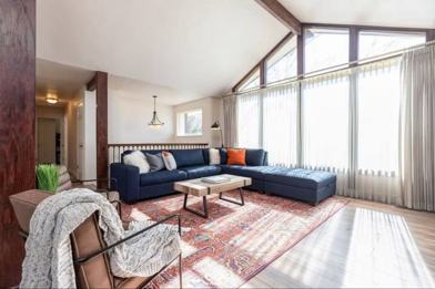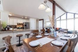 The home offers a bright and inviting living room with vaulted ceilings and a flat-screen TV. The fully equipped kitchen features stainless steel appliances, cookware, and dining essentials, with a large dining table and breakfast bar. Enjoy the game area with a pool table, ping pong, and a guitar. Relax in the private hot tub and use the outdoor pizza oven.