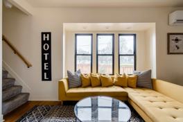 Freshly remodeled from top to bottom, this home blends original character with modern upgrades throughout. The main floor features an open-concept kitchen, living, and dining area with quartz countertops and new top-of-the-line appliances, as well as refinished hardwood floors and tall ceilings preserving the home's classic charm. The kitchen is equipped with a dishwasher and full cookware. There is one bedroom with a queen bed and a full bathroom with an original cast iron clawfoot tub on the main floor. The second floor offers three additional bedrooms, each with a queen bed, and a full bathroom with a shower.