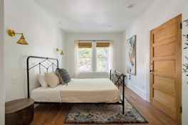 The main level features a cozy living room with a Smart TV and original wood floors. The fully equipped kitchen includes a gas range, full-size fridge, microwave, and Keurig. Thoughtful touches and minimalist decor are featured throughout. A mini-split A/C and heat provide year-round comfort.