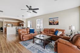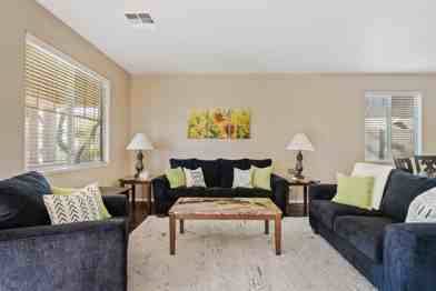 This centrally located property within Johnson Ranch offers a private saltwater pool and spa, along with access to three heated community pools, basketball courts, sand volleyball, and more, just steps from the house. The master bedroom is spacious with a two-desk office space and an en-suite bathroom with a large closet. The open-concept kitchen, dining, and living room area is perfect for family gatherings, and there's an additional den area with a game table and a cozy couch for reading.