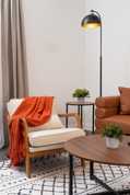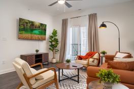 This modern apartment is designed for comfort and functionality with an open-concept layout and soaring 9’ ceilings. It boasts stainless steel appliances, quartz countertops, and a walk-in kitchen pantry. Large windows and ceiling fans are present throughout, along with a smart thermostat and electronic door key system for added privacy.