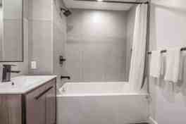 This apartment comes fully equipped and ready to roll, featuring work-from-home desks and a fully equipped kitchen. Each bedroom has closet space, with two bedrooms opening out to their own spacious private balconies. The contemporary kitchen is finished with Italian porcelain tile backsplash and frost white quartz countertops, featuring all stainless-steel appliances, including a dishwasher and in-unit washer-dryer. The bathroom is beautifully finished and includes a glass-partitioned deep soaking tub. Enjoy added touches such as a 50-inch flat-screen TV, luxurious linens, plush towels, and a fully stocked kitchen with a refrigerator, oven range, microwave oven, and coffee maker. A hairdryer and an iron/ironing board are also available.