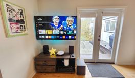 The home embraces pop culture with themed bedrooms and entertainment in mind, accommodating up to six guests. It features two spacious living rooms with comfy couches, a large-screen HD TV, and two dedicated workspaces equipped with sit/stand desks. The full kitchen and laundry room are at your disposal. The expansive backyard includes a patio with outdoor seating and dining, a Weber gas BBQ grill, and a fire pit, ideal for relaxation and gatherings.