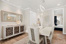 The furniture is comfy and there is plenty of room for you to have your own space. The apartment sleeps six with two king-size beds in the master bedrooms and a sleeper sofa in the living room. Enjoy dining room seating for six with a bar cart, a smart TV, Wi-Fi, air conditioning, and board games. A starter pack of toiletries is also provided.
