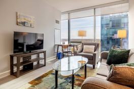 This gorgeous apartment features a breakfast bar, walk-in closet, oversized windows, smart home technology, panoramic views, quartz countertops, and energy-efficient appliances.