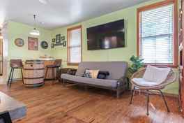 This Downtown Gem perfectly blends historic charm with chic style. The dining room offers a table for six and a cabinet filled with games for indoor fun. Relax in the cozy living room with a couch, accent chair, futon, and large smart TV. The fully equipped kitchen includes pots, pans, and a variety of coffee makers. The apartment also features a separate game room with a ping pong table and badminton gear for outdoor play.