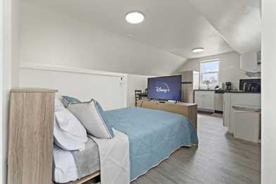 Stay in this super unique, freshly remodeled studio in Nampa, offering 200 sq ft of living space. This upstairs unit provides a comfortable full-size bed with a storage area and a dedicated workspace with a beautiful window view. You'll enjoy the convenience of a private full bathroom and laundry, along with easy self-check-in via an electronic door lock. Please note that this apartment is part of a triplex, and you may occasionally hear tenants downstairs. Free street parking is available, and you'll need to go up and down a flight of stairs each time you enter or exit.