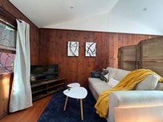 This cottage blends rustic charm with modern convenience and offers comfortable furnishings and a fully equipped kitchen that includes a full-size refrigerator, smart countertop oven, microwave, and cooking essentials for easy meal preparation. Enjoy fast Wi-Fi, a private in-unit laundry with a dedicated washer and dryer for guest convenience, and a tranquil garden setting.