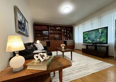 • Three fully furnished bedrooms (queen beds + custom closets with built-in shelving)